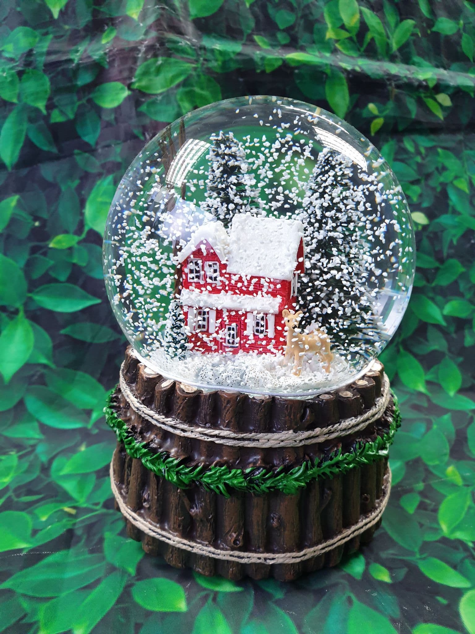 Add a charming touch to your holiday decor with this snow globe featuring a lovely red house and a sweet deer in the foreground. Adorned with two small trees one in the front and one to the side, as well as two larger trees in the back, this snow globe captures the essence of a peaceful winter scene. Give it a shake to watch the snowfall, and wind the base to enjoy festive Christmas tunes. Perfect for creating a festive atmosphere.